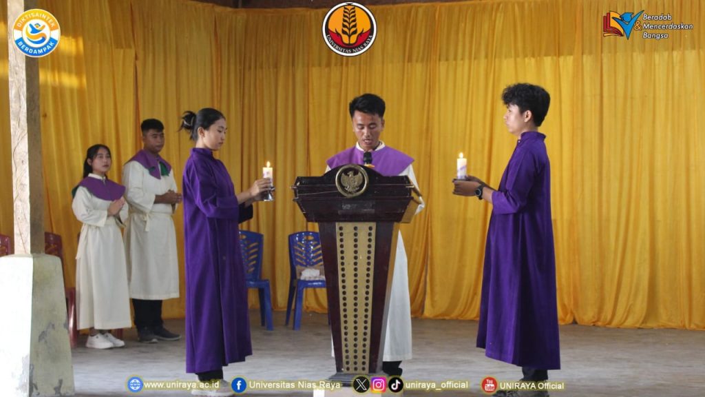 Universitas Nias Raya, 05 Desember 2025, Unit Kegiatan Mahasiswa Komunitas Mahasiswa Katolik (UKM KMK) Universitas Nias Raya secara resmi memulai perjalanan organisasinya dengan menggelar Misa Perdana pada Jumat, 05 Desember 2025. Bertema “Terjadilah padamu menurut imanmu” dengan sub tema “Melangkah maju dengan iman, meneguhkan cita-cita akademik sebagai wujud Fiat diri”, perayaan Ekaristi yang dipimpin langsung oleh Pastor Alfonsius Laia, Pr. ini diselenggarakan di Aula Universitas Nias Raya pukul 09.00 WIB dan dihadiri oleh pimpinan kampus, dosen, serta mahasiswa.