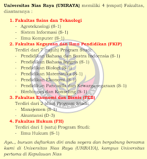 Sebelumnya, diberitakan Universitas Nias Raya mendapatkan ijin operasional, ditetapkan dengan SK Dikti No. 363./E/0/2021 tertanggal 29 Juli 2021 dan UNIRAYA ini merupakan universitas pertama yang ada di Kepulauan Nias.