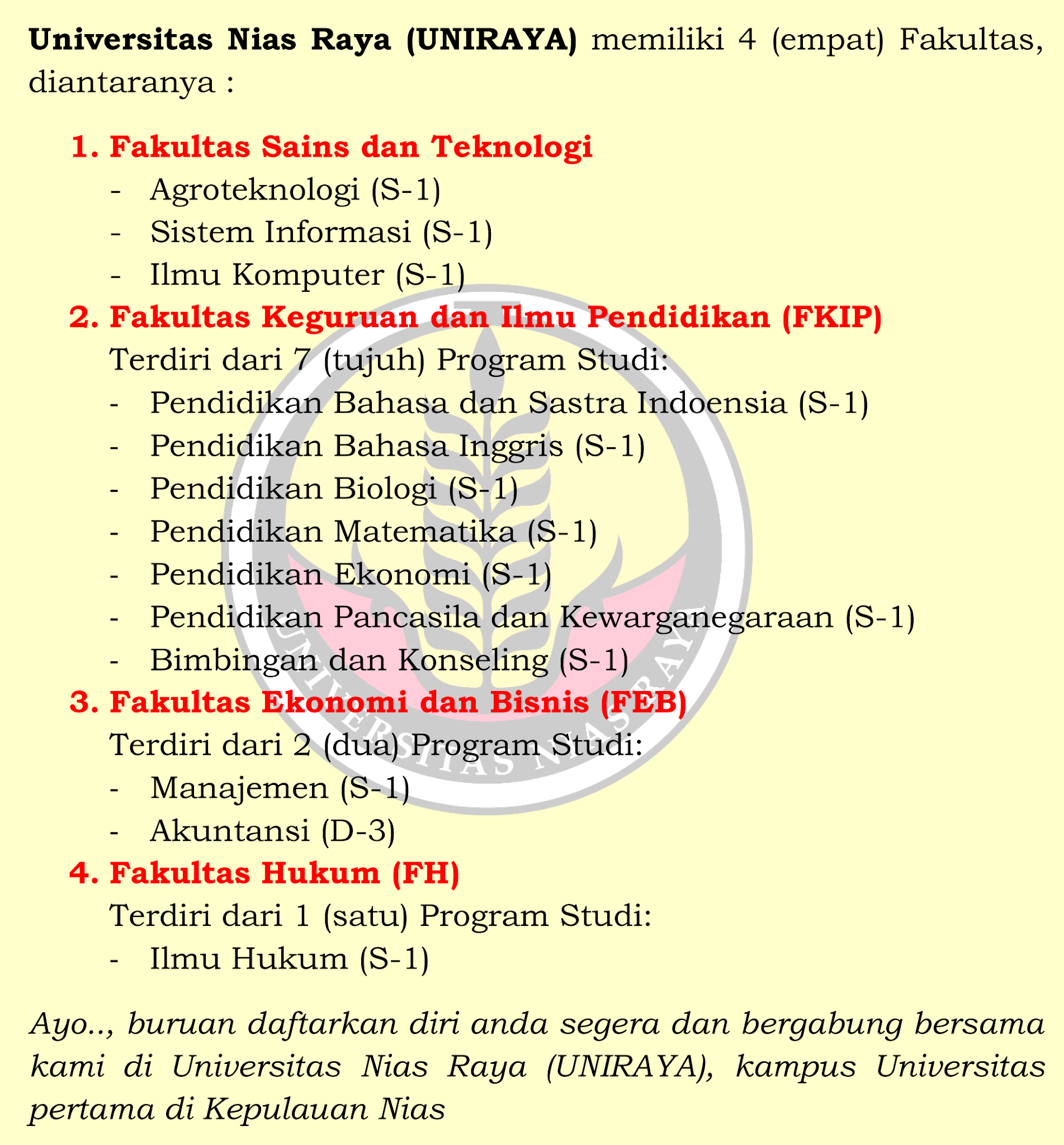 Nias Selatan – Sehubungan dengan keluarnya ijin operasional Universitas Nias Raya (UNIRAYA), panitia penerimaan mahasiswa baru memutuskan perpanjang pendaftaran mahasiswa baru.